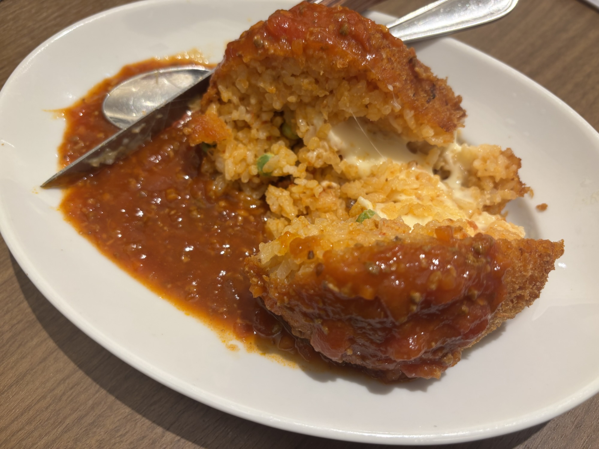 トマトソース、衣、中のライス、チーズすべてが分離していて、口の中でちぐはぐとした状況で、調和があまり感じられませんでした。