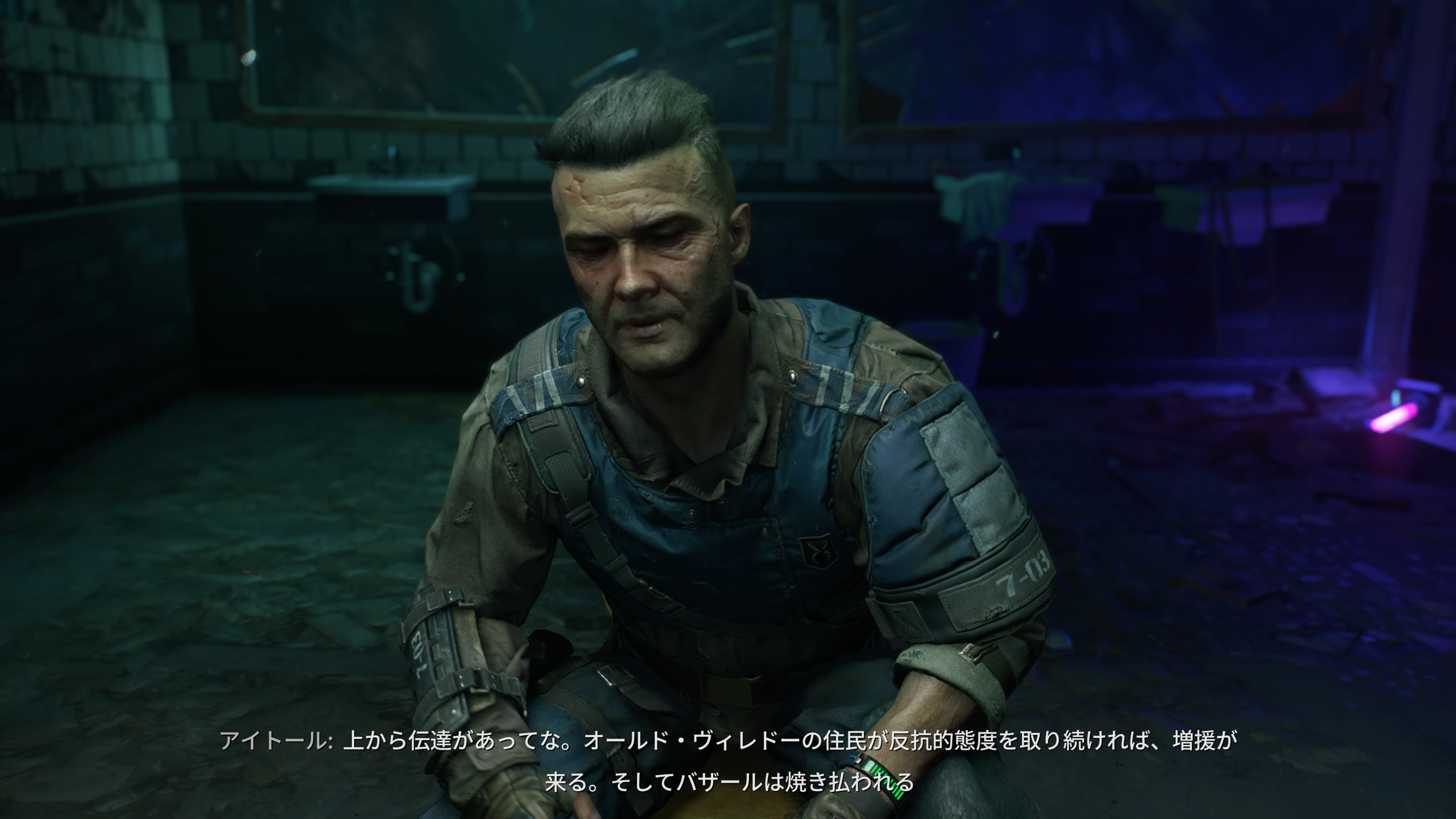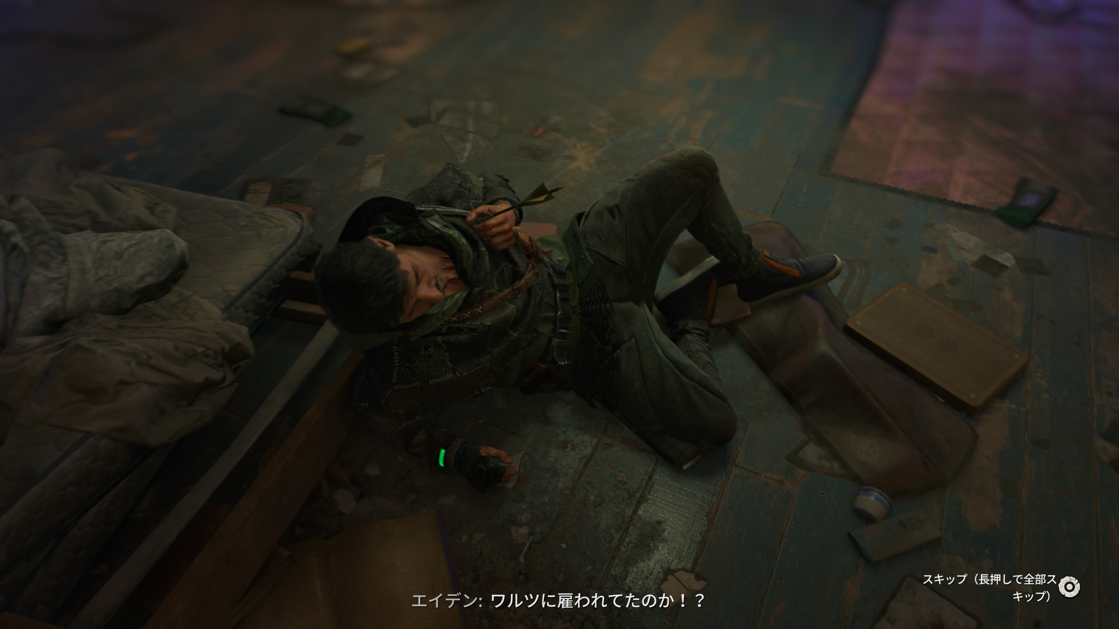 ピースキーパーとサバイバーの死体の山で、アイトールに無線で報告しようとすると、その瞬間をバーニーに見つかり、バザール上層部からエイデンはピースキーパーと裏でつながっている裏切り者と嫌疑をかけられる。