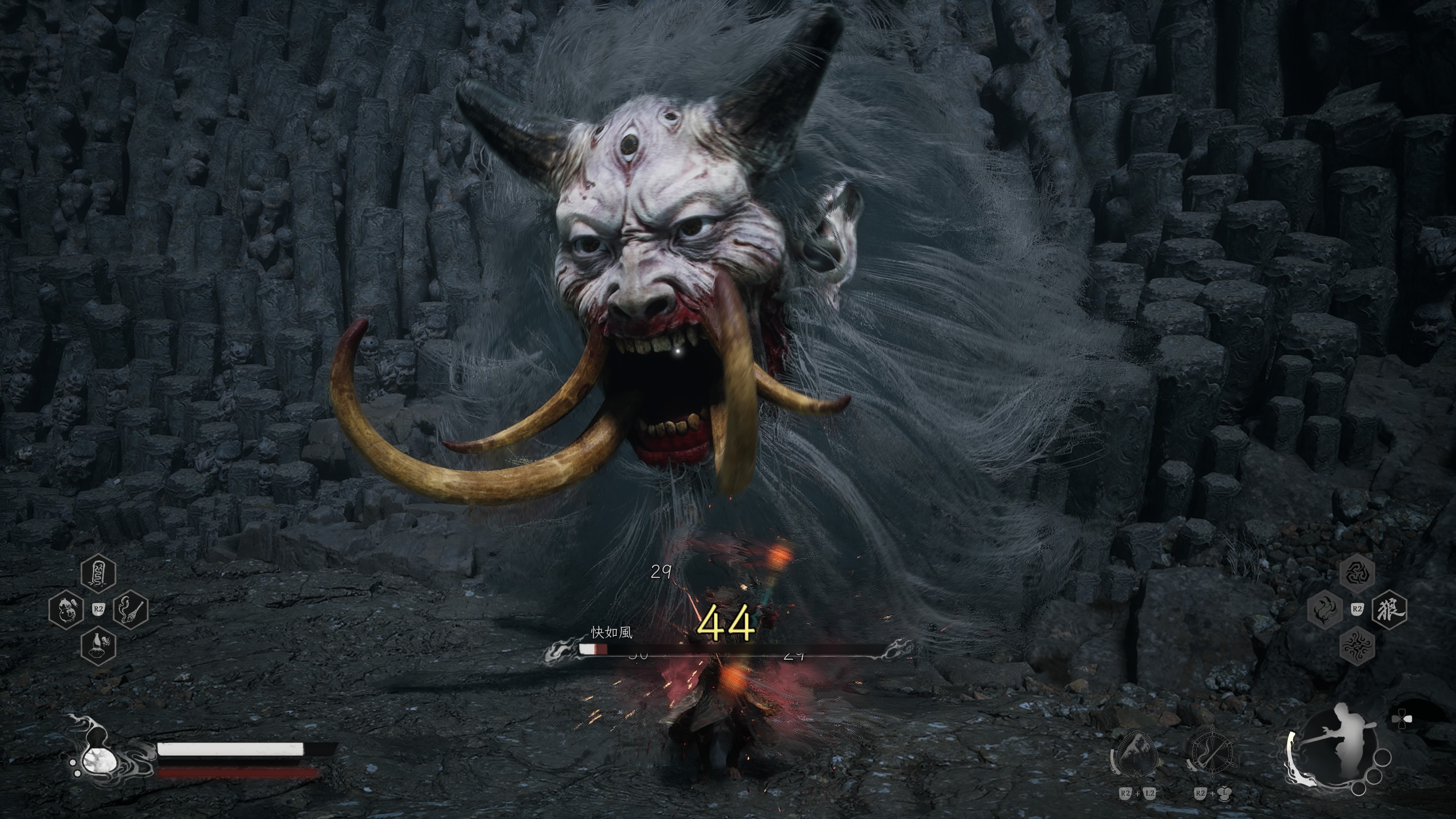 大聖は、主人公と同じように定身術などもしてくるが、基本的な攻撃は、こちらと同じようなもので、ディレイもかかっていないから、回避もしやすい。ジャスト回避できなかったとしても、攻撃範囲外に逃れやすい。
