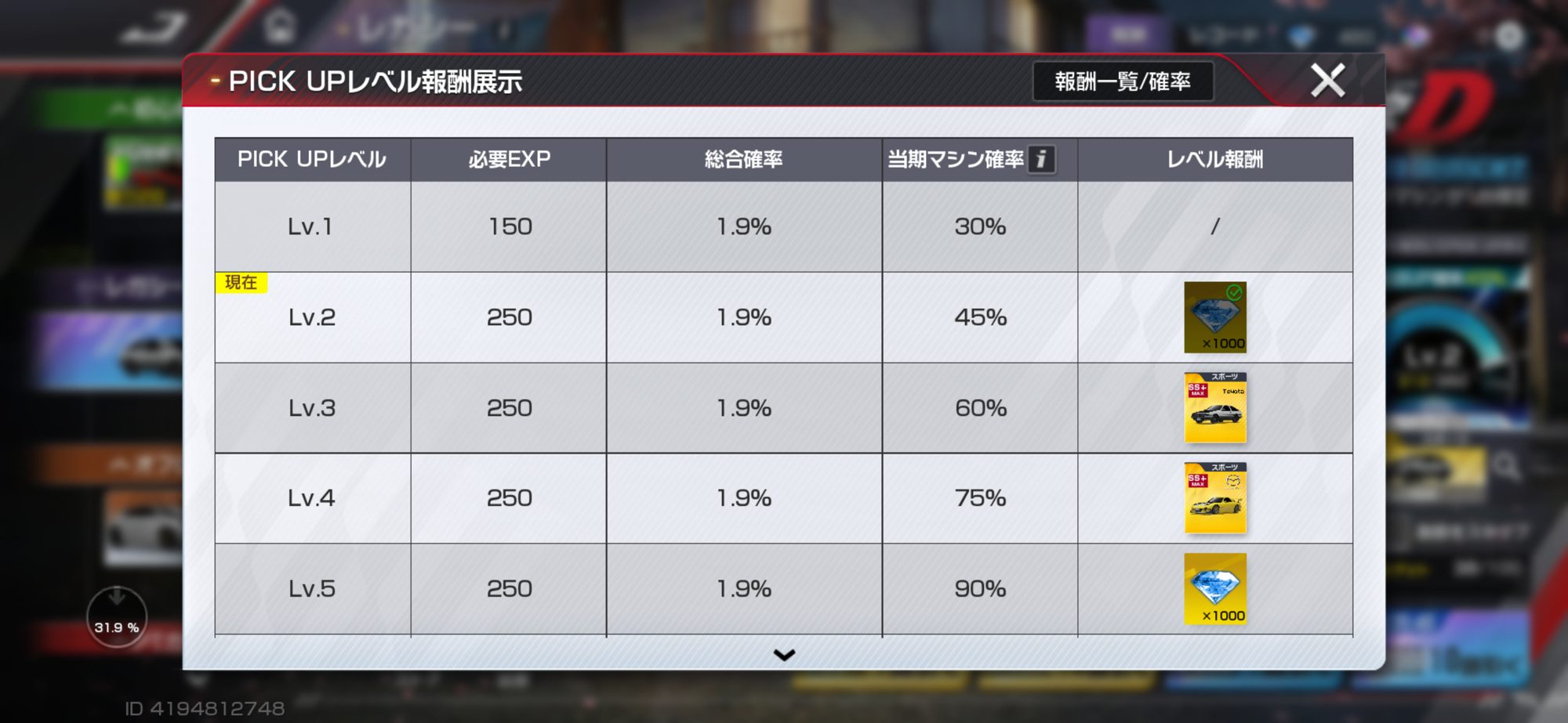 噂によると、ガチャ天井が台湾版と日本版で違うらしい。頭文字Dに対して熱量のある、課金したいというプレイヤーは日本人の方が多いとしても、これが本当ならがっかり。