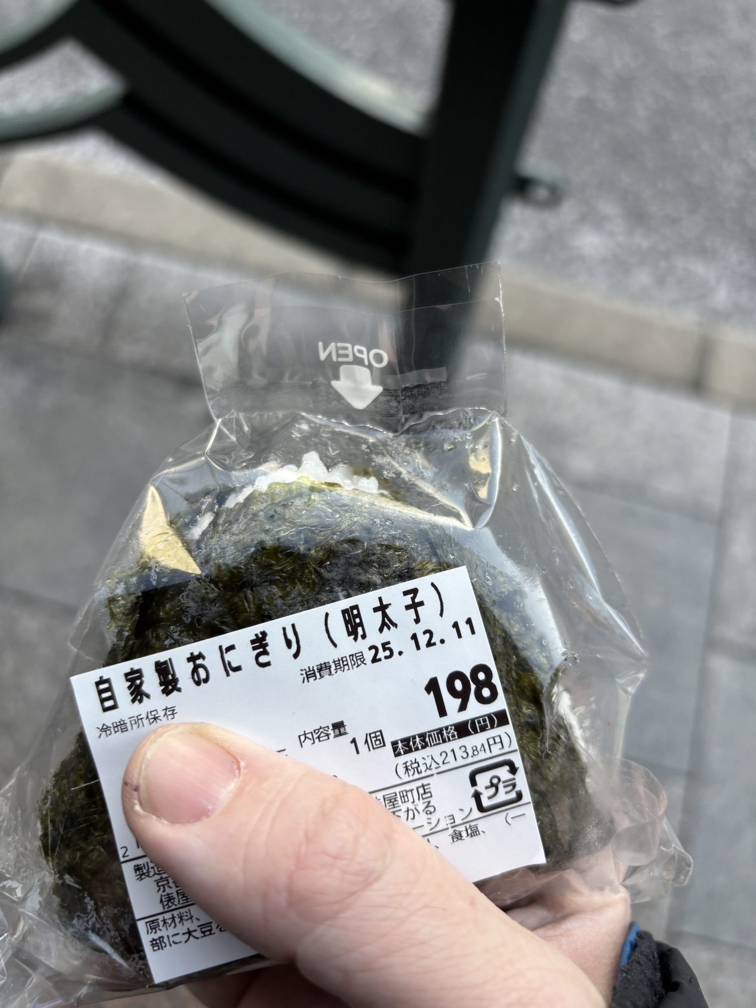 普通のおにぎりが98円とかだったが、この手作りおにぎりは198円と少し高い。コンビニおにぎりレベルの高さ。