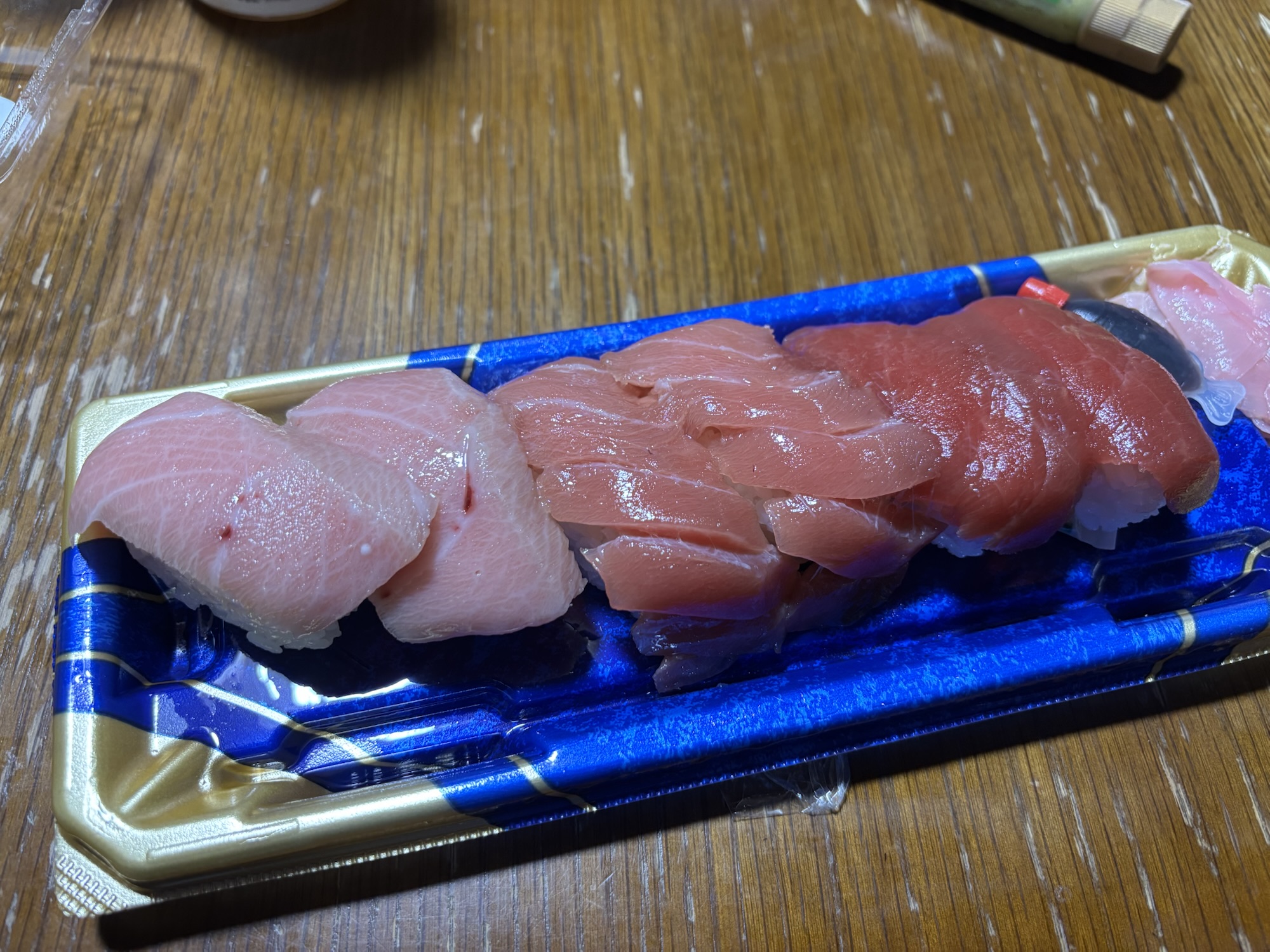 大トロはいわずもがな素晴らしい。口の中にいれたらすぐにきえて、甘みととろみが絶妙だ。これがスーパーで食べられるなんてすごい時代だ。
