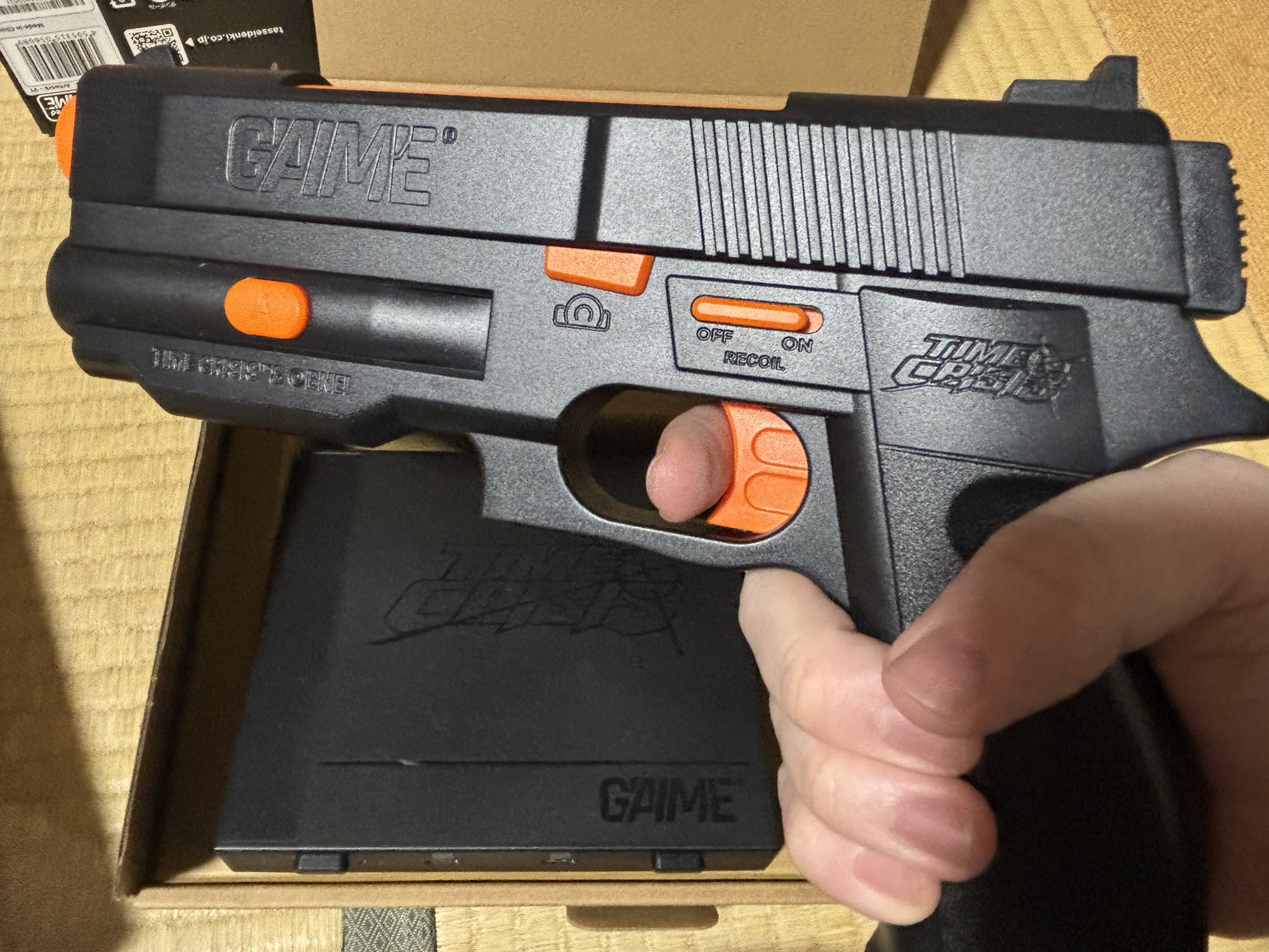 「バンダイナムコゲームス公式商品」って記載されているだけあって、パッケージも技術メーカーがつくりましたよって地味さはなく、本当にバンダイナムコが現代でタイムクライシス出したらこんな見た目になるねって見た目です。