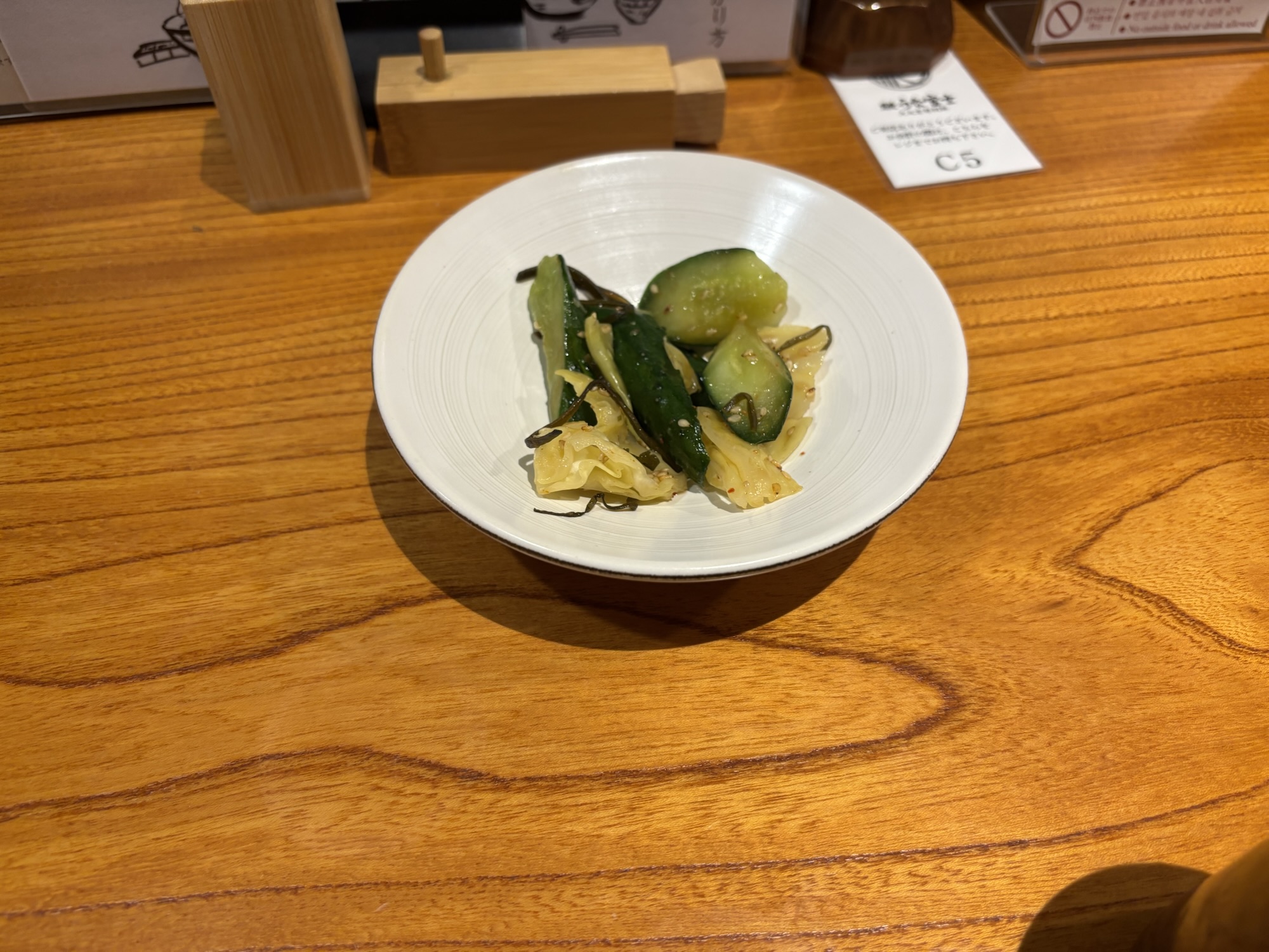 注文前に温かいお茶と一緒に御通しのようなもので、こちらきゅうりと白菜に塩昆布をからめたつけものが出されました。