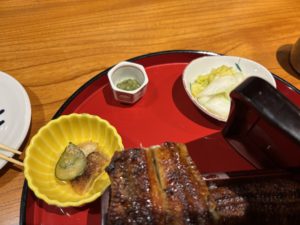 お吸い物、白菜、酢でつけた鰻?などもついており、鰻単品だけでなく、コース料理のような贅沢感もあります。