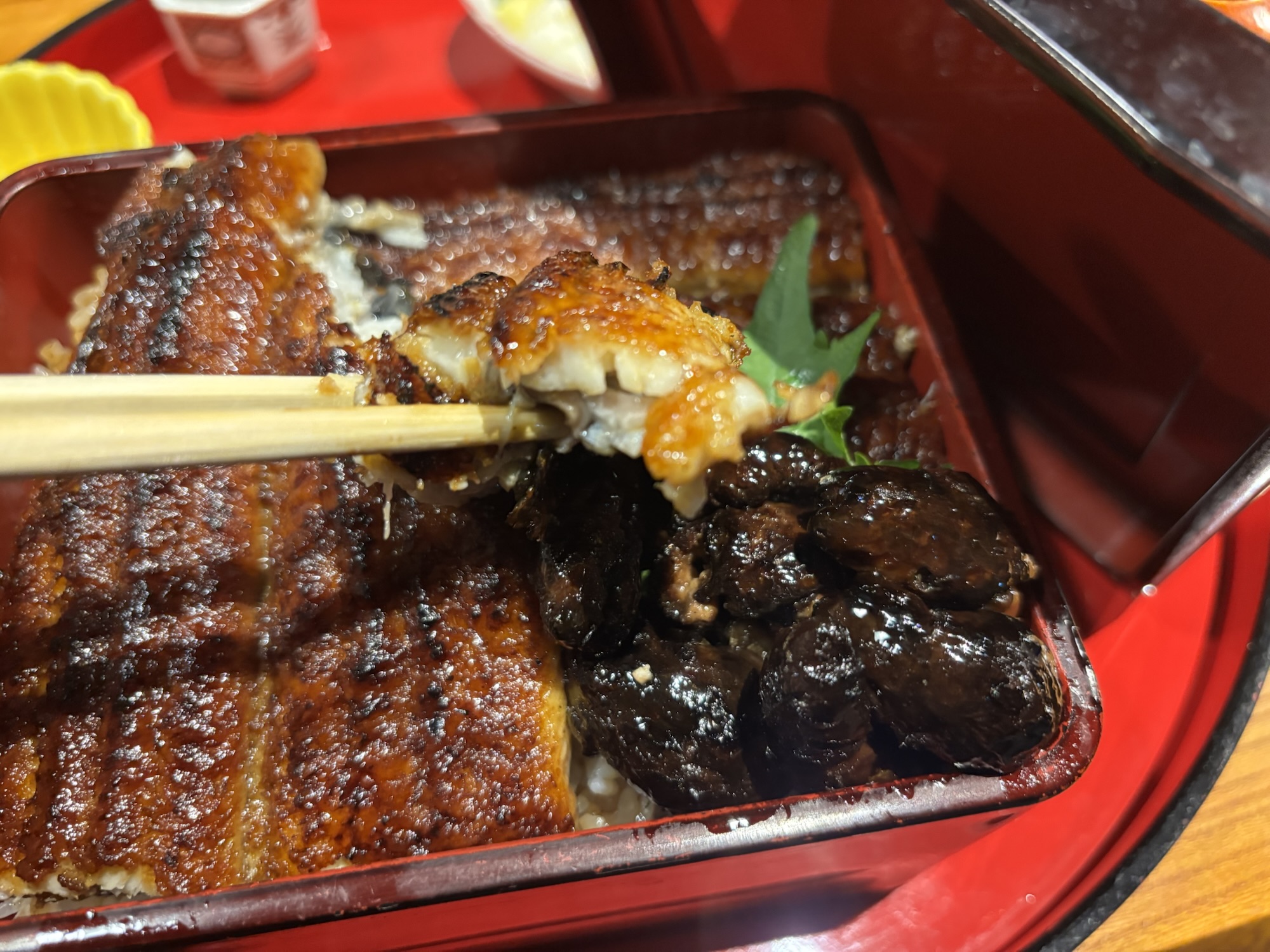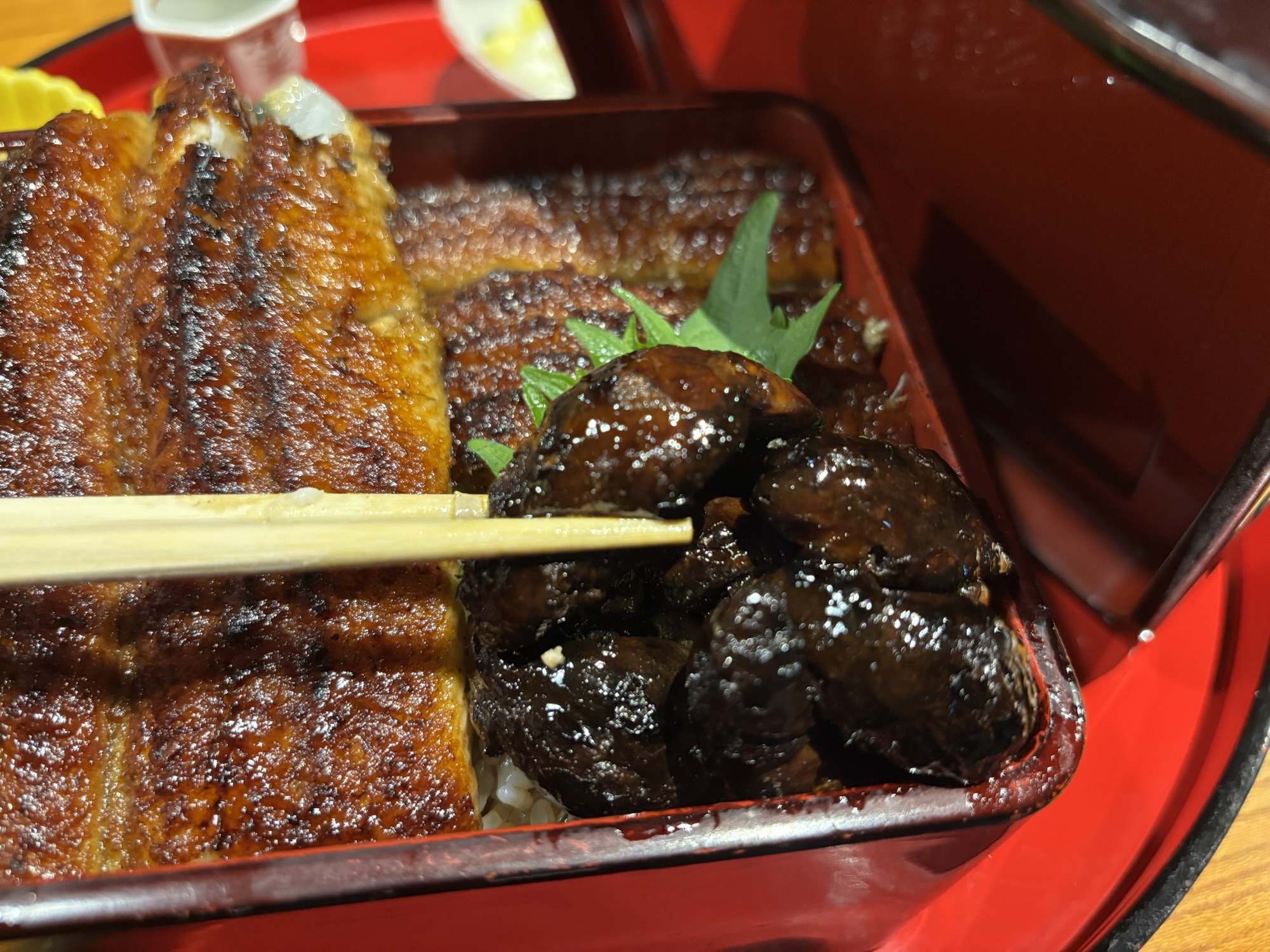 上の時点でいままで食べたうな重の中で最大級のでかさでした。写真の青鰻がちゃんと2きれはいっており、肝も存在感がやばすぎます。