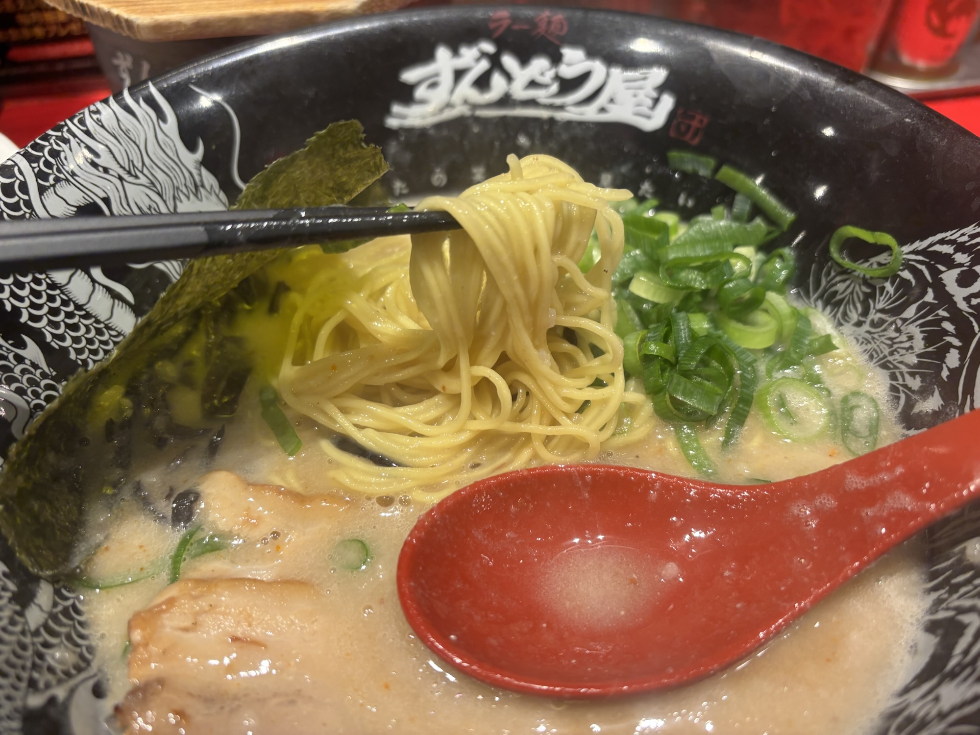 普通にすすっているだけなのに、細麺にしっかりと濃厚豚骨が味わえる内容になっており、細麺の甘さと濃厚豚骨の相性が絶妙。